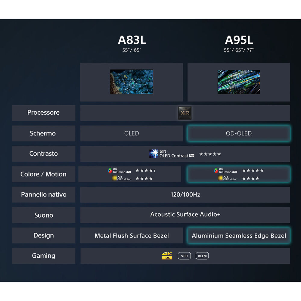 Altre caratteristichePannello: Risoluzione QFHD (4K 3840x2160 pixel); OLED; Pixel Contrast Booster; OLED XR Contrast Pro (prestazioni elevate del pannello OLED); XR Triluminos Pro; Wide Angle; Rich Color Enhancer; XR OLED Motion, Auto Mode (Immagini nitide e fluide con frequenza nativa pannello 120Hz); Frame Blinking. Video: Cognitive Processor XR; 4K HDR (HDR10 / HLG / Dolby Vision); XR Clear Image; XR 4K Upscaling (il miglior upscaling per immagini da 2K a 4K); XR Super Resolution (migliora il dettaglio si ogni singolo oggetto); XR HDR Remaster (immagini con la miglior qualità prossima ad HDR); XR Smoothing (colori con sfumature più lineari senza effetto banding); Precision Color Mapping (integrato in XR Triluminos Pro); Rilevamento del punto focale (come nella visione umana); Dolby Vision; IMAX Enhanced; Dynamic Contrast Enhancer; Dual database processing (migliora i dettagli e della texture video); Tecnologia Live Colour; Netflix Adapttive Calibrated Mode; BRAVIA CORE Calibrate Mode; CalMAN Auto Calibration con l'app 'CalMAN for BRAVIA' (CMS con White Balance 20pt); Modalità Immagine: Brillante, Standard, Cinema, IMAX Enhanced, Gioco, Grafica, Foto, Personale, Dolby Vision (Brillante / Luminoso / Scuro), Modalità Calibrata per Netflix, Modalità Calibrata BRAVIA CORE. Audio: Acoustic Surface Audio+ (lo schermo è lo speaker); 3.2ch, 3 Attuatori + 2 Subwoofer; 3 Attuatori nello schermo; Amplificatore Digitale S-Master 50 Watt (10W attuatore Centrale) + (10W+10W Attualtori L/R) + (10W+10W Subwoofer); Acoustic Auto Calibration: (ottimizza l'audio in base all'ambiente e alla posizione d'ascolto dello spettatore); Codifica Dolby: Dolby Atmos, Dolby Audio; Acoustic Center Sync (speaker centrale per Soundbar compatibili); Ready for 360 Spatial Sound Personalizer (con WLA-NS7); Vertical Surround Engine; Audio via Bluetooth (Soundbar, Cuffie o Wireless Speakers compatibili); 3D Surround Upscaling; Voice Zoom 2; Modalità Audio: Standard / Dialogo / Cinema / Musica / Sport / Dolby. Gioco: Perfect for PlayStation 5; Auto HDR Tone Mapping; Auto Genre Picture Mode; Game Menu; Dimensione immagine regolabile (con aggiornamento firmware); Crosshair (visualizza un mirino nell'area di gioco - 6 tipologie); Black Equalizer (visualizza gli oggetti anche in ombra); Motion Blur Reduction; 4K120 / VRR (Variable Refresh Rate) / ALLM (Auto Low Latency Mode). Network: Wi-Fi Integrato a/b/g/n/ac 2.4GHz / 5GHz; Wi-Fi Direct (connessione diretta con dispositivi wireless solo 2,4GHz); Home Network Client / Renderer (condivisione in rete locale di file multimediali Foto, Video e Musica). Funzionalità USB: File e Formati supportati: Foto, Video e Musica su FAT16, FAT32, exFAT, NTFS file system; Riproduzione Video (Codec): MPEG1 / MPEG2 (PS,TS,HDV,AVC,AVCHD) / MP4 (XAVCS,AVC,MPEG4,HEVC) / AVI (Xvid / MotinJpeg) / ASF (WMV) / VC1 (MOV) / AVC (MPEG4,MotinJpeg) / MKV (Xvid,AVC,MPEG4,VP8,HEVC) / WEBM (VP9,VP8,3GPP) / MPEG4 (AVC); Riproduzione Foto: JEPG / ARW (solo in miniatura); Riproduzione Musica (Codec): MP3 / ASF (WMA) / LPCM / WAV / MP4 (AAC) / FLAC. Connessioni: 4 HDMI 1/2/3/4 con HDCP 2.3 - HDMI 3/4 segnali 4K fino a 48Gbps; HDMI 1/2 segnali 4K fino a 18Gbps; HDMI 3/4 compatibile con Gaming mode 4K120 / VRR / ALLM; HDMI 3 con eARC (Enhanced Audio Return Channel per audio High; Bitrate e object based fino a 192kHz / 24bits, Dolby Atmos / DTS:X); 2x Ingressi USB: 1x SS-USB 3.1 / 1x USB 2.0; 1x Cam Slot CI+ (per i canali a pagamento del DTT e Satellitari e per la visione di Tivùsat anche in UHD); Bluetooth Versione 4.2 (HID / HOGP / SPP / A2DP / AVRCP); 1x Ingressi Video Composito Minijack (in comune con S-Center Speaker); 1x Ingresso Ethernet; 1x Ingresso antenna RF (digitale terrestre); 2x Ingressi antenna IF (digitale satellitare); 1x Ingresso Video Composito (in comune con S-Center Speaker); 1x ingresso S-Center Speaker (per Soundbar compatibili); 1x Ingresso Audio (conversione analogica); 1x Uscita Audio Digitale Ottica; 1x Interruttore microfono incorporato. Design: Metal Flush Surface; Cornice colore Titanium Black; Nuovo Design del telecomando Vocale Premium Retroilluminato Bluetooth in alluminio; Piedistallo Metal Slim Wedged colore Titanium Black a 3 posizioni (standard, stretto o soundbar).
