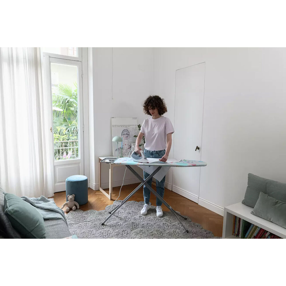 Copriasse: La fodera è composta da due strati, uno di schiuma e l'altro di cotone, che offre un maggiore comfort durante la stiratura e uno scorrimento facile del ferro. Struttura dell'asse: L'asse è progettata per consentire al vapore di passare attraverso i tessuti, riducendo l'umidità dei vestiti. Design: Le sue gambe con piedini antiscivolo garantiscono una maggiore stabilità all'asse da stiro.
